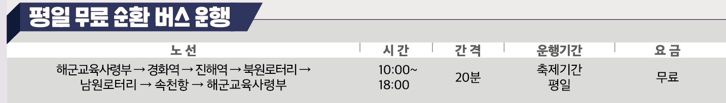 평일: 해군교육사령부 출발 도착 순환버스 , 10:00~18:00(20분 간격, 무료 운행)