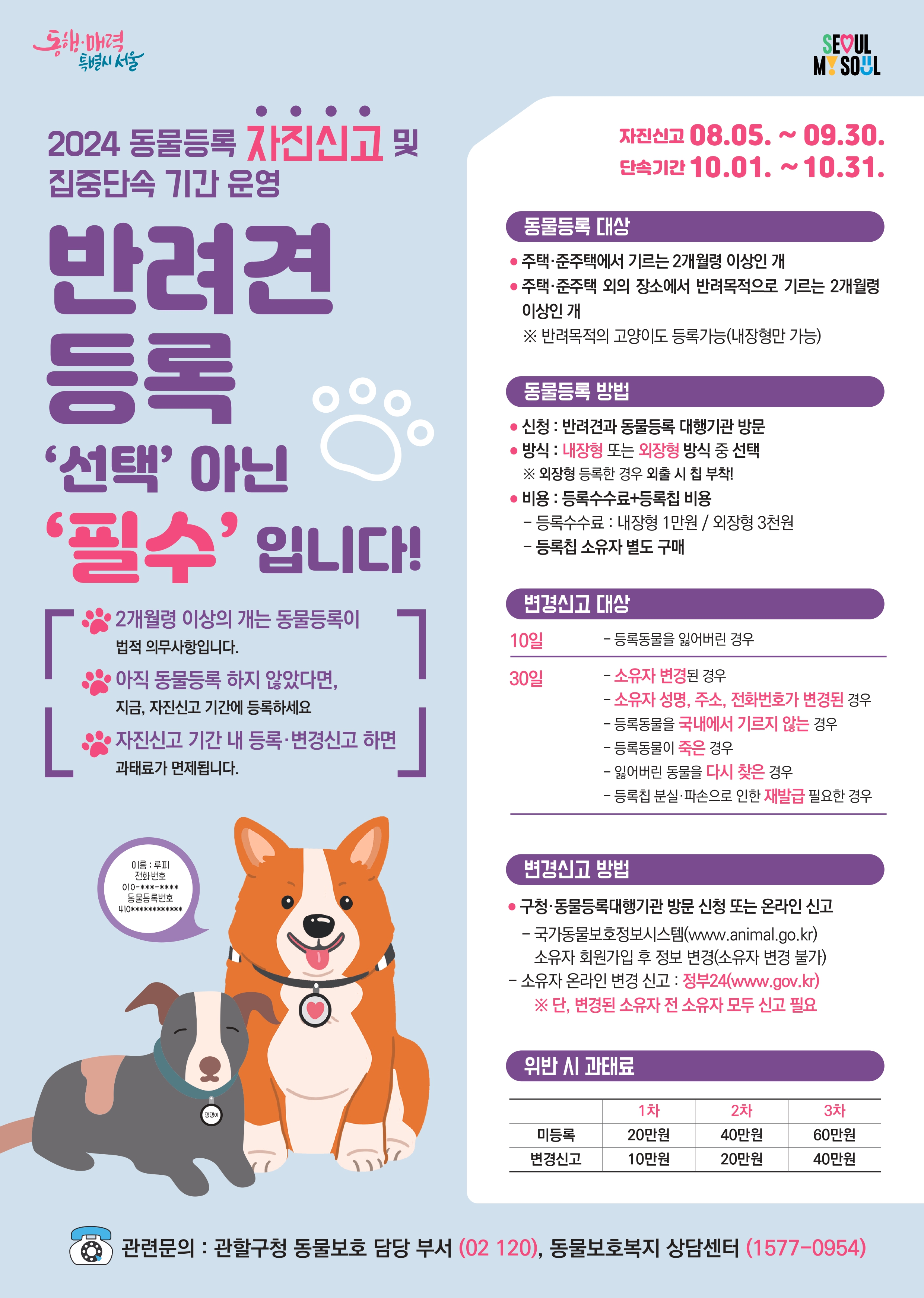 2024년 9월 30일까지 반려동물등록 자진신고 기간입니다. 서울시에서는 자진신고 기간 안에 등록시 선착순으로 내장칩 할인혜택(1만원으로 등록)도 받을 수 있으니 어서 신청하세요. 10월부터 집중단속 기간이 바로 시작되고 적발되면 과태료가 최대 100만원입니다. 등록방식, 방법, 1만원 등록법, 기간, 과태료 및 유의사항을 참고하시길 바랍니다.